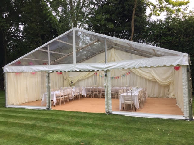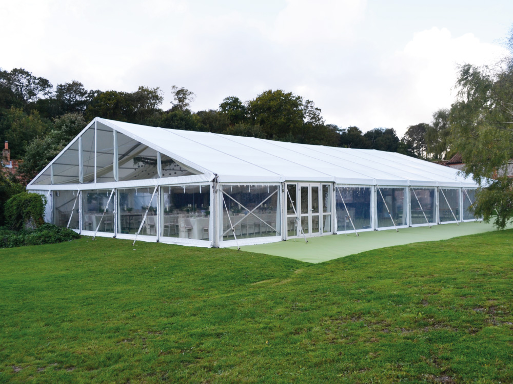 The clearspan Marquee is exactly that, very robust with full clear internal span with no central support poles. These are available in widths of 6m, 9m and 12m. These structures are robust and are flexible in lengths meaning they can increase in 3m bays in length to cover an area as large as is required. White PVC roofs are standard with either plain white or Georgian window walls. These clearspan Marquee’s can also be fitted with full or partial cristal clear PVC roofs and walls depending on your requirements. Suitable for use on grass where staking is possible or a hard surface with appropriate weighting.